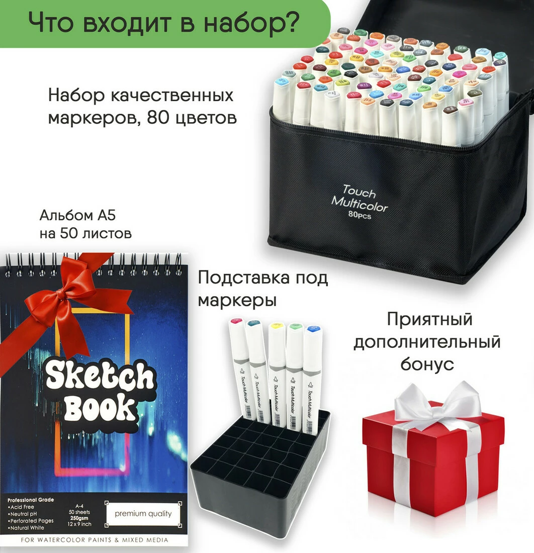 Вы покупаете Набор маркеров двусторонних Touch Multicolor 80 цветов и в подарок получаете Бумагу для скетчинга и рисования в формате А5.