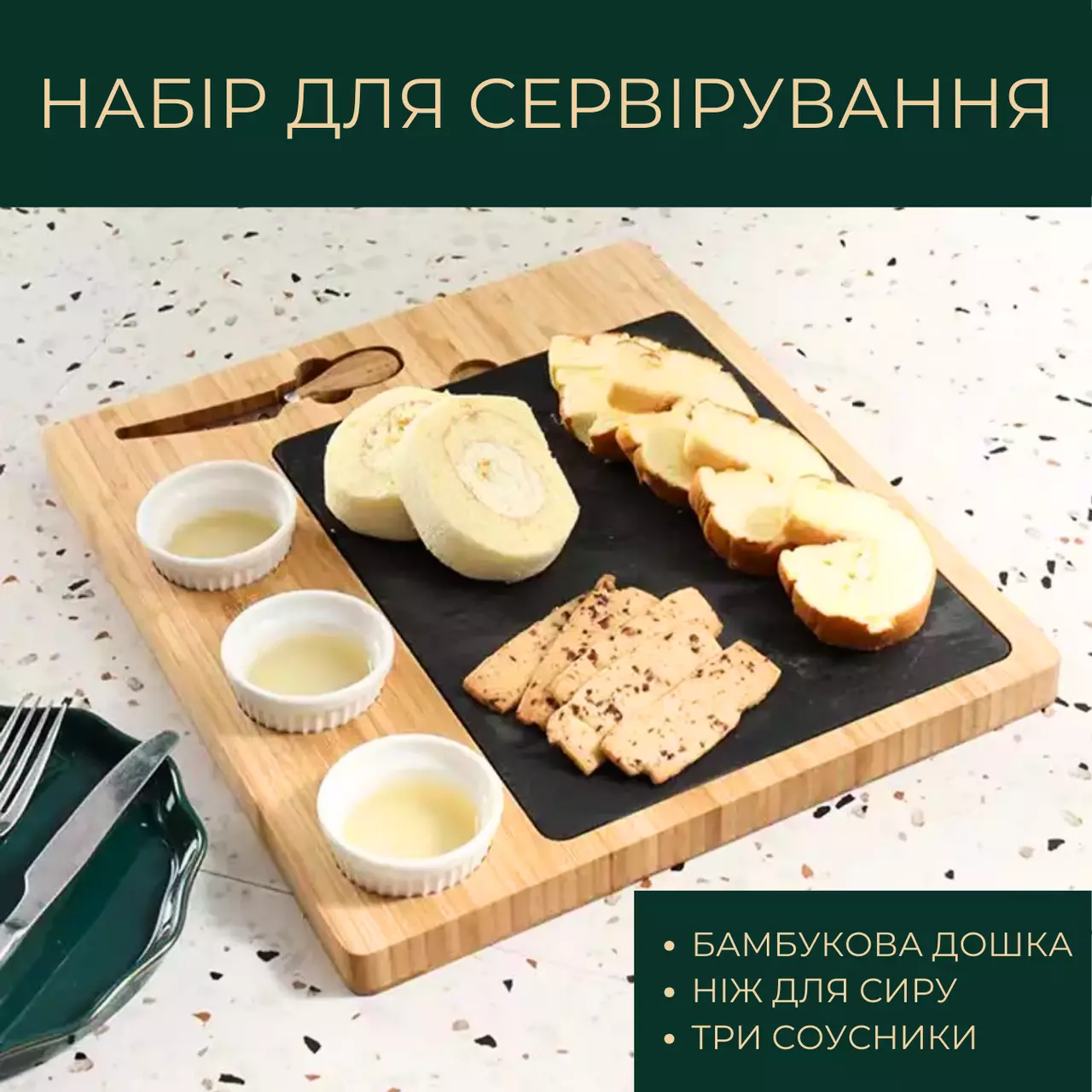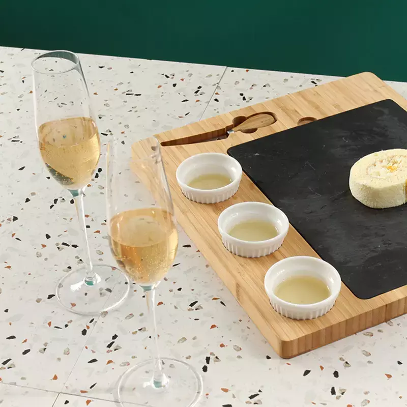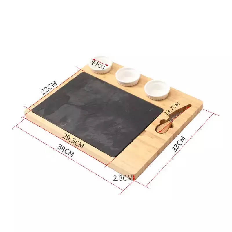 Комплектация: доска, нож для сыра, 3 керамических соусника