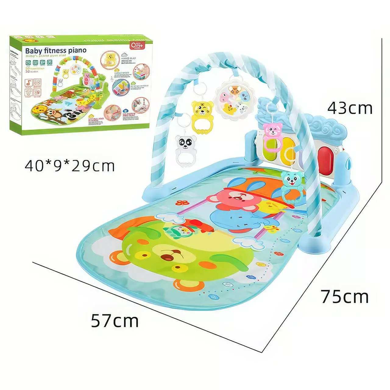 Развивающий детский коврик с пианино, подвесными игрушками, шкалой роста, голубого цвета, принт животные