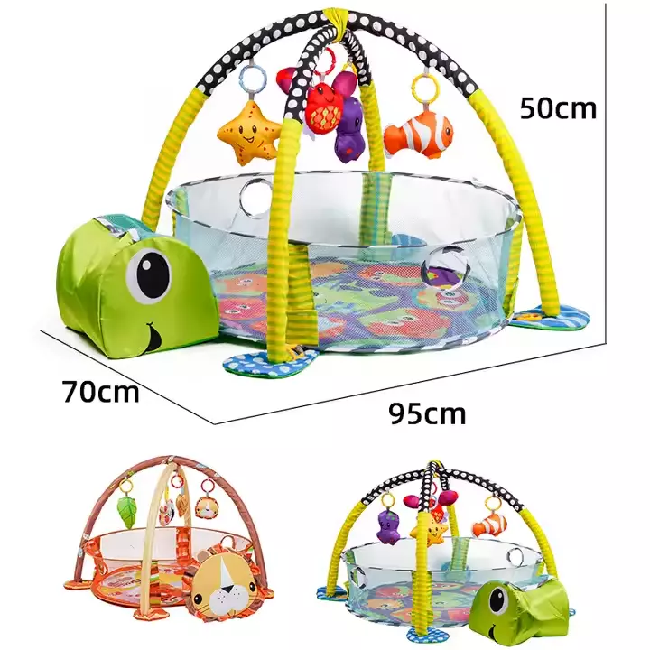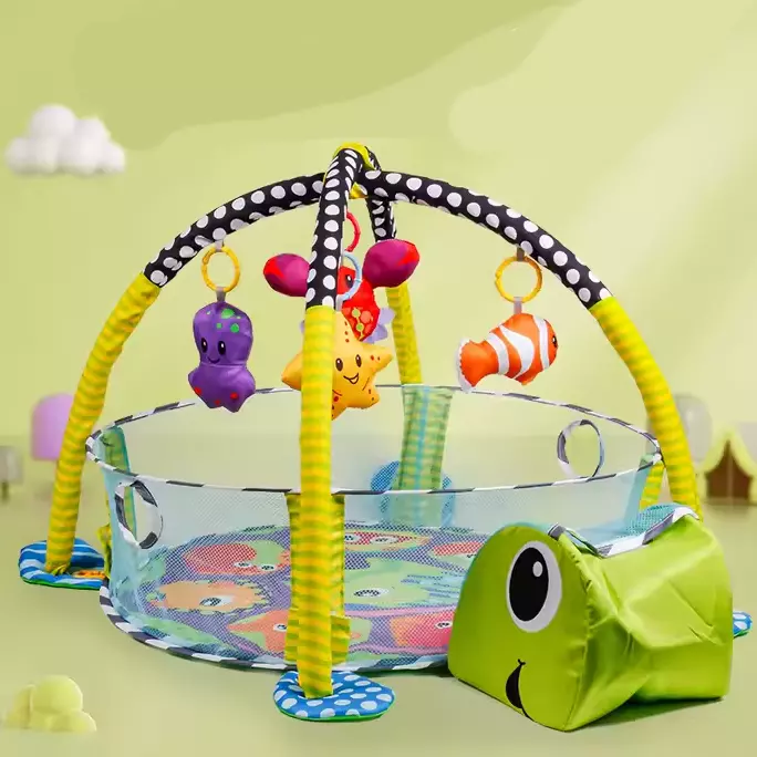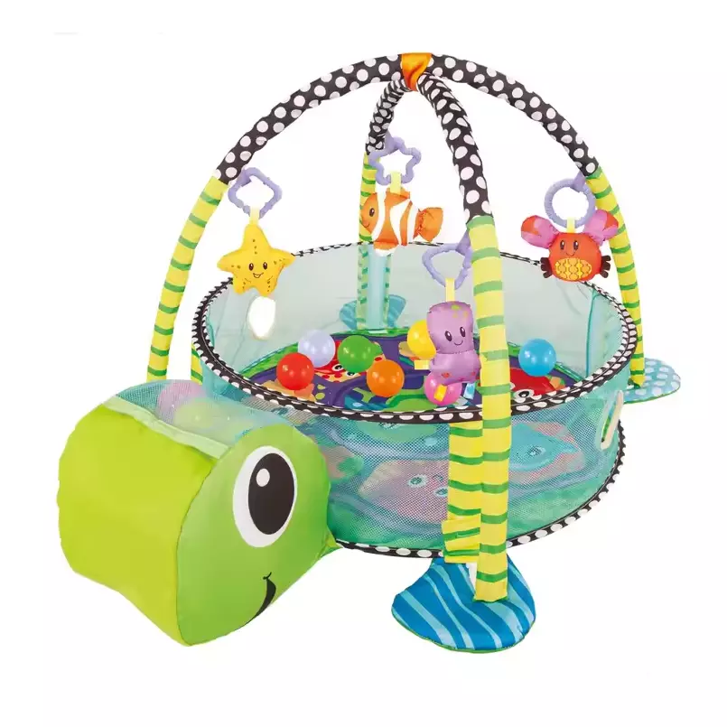 Коврик оснащен двумя перекрестными дугами и 4 съемными подвесными игрушками, которые можно использовать отдельно. В "панцире" черепахи удобно хранятся 30 шариков, идеально подходящих для игр в мини-манеже.