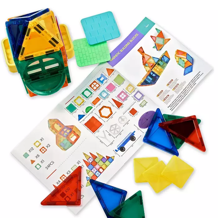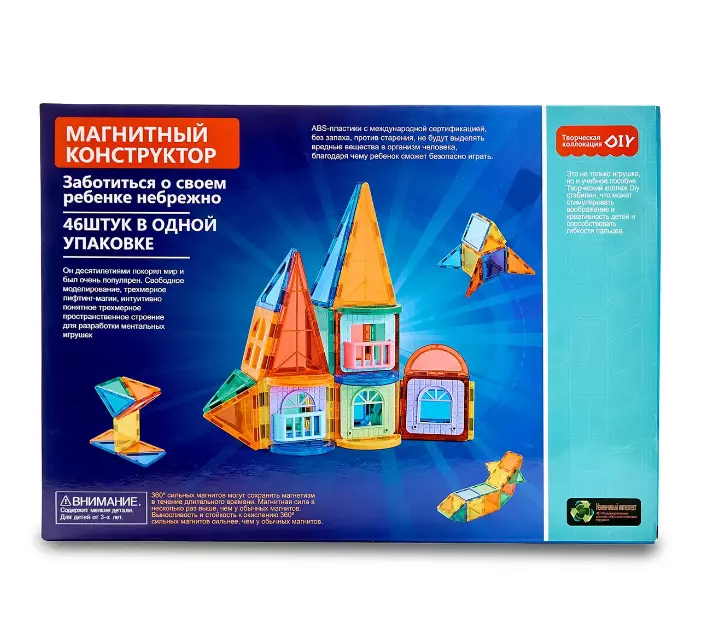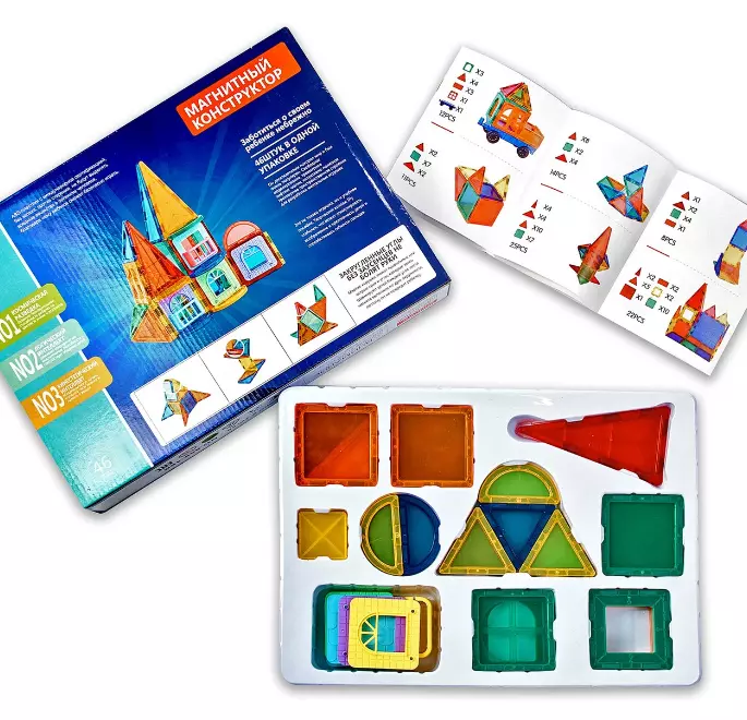 Особенность такого конструктора состоит в том, что детали крепятся друг с другом при помощи магнитов, которые помещены в пластиковый корпус. Вращаясь, в зависимости от необходимого полюса, магнитные детали всегда притягиваются друг к другу, что позволяет создавать много разнообразных конструкций. Данный набор состоит из 46-ти элементов.