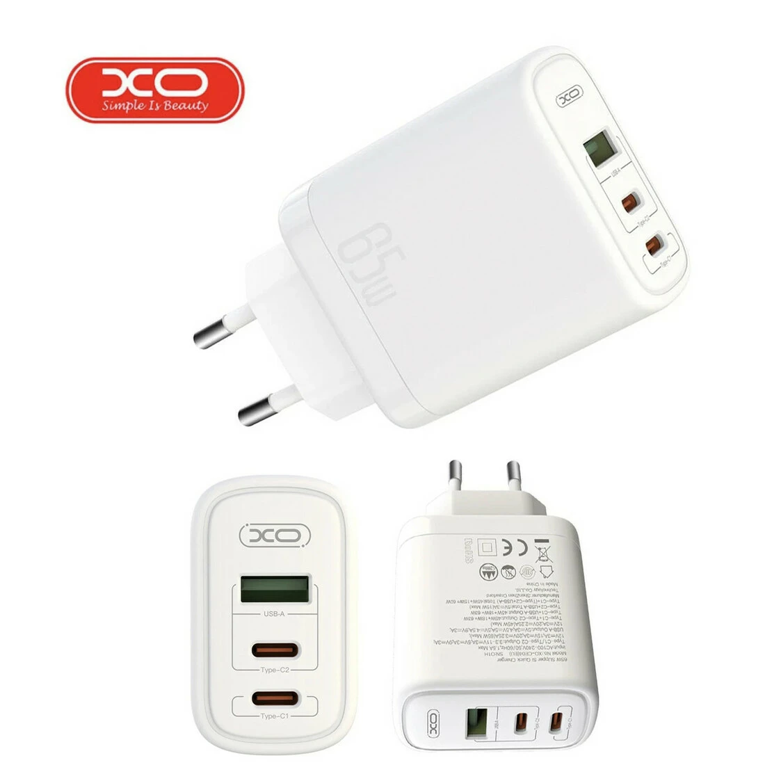 Сетевое зарядное устройство XO CE04 PD65W+QC 45W 2Type-C/1USB зарядный блочок для телефона Белый
