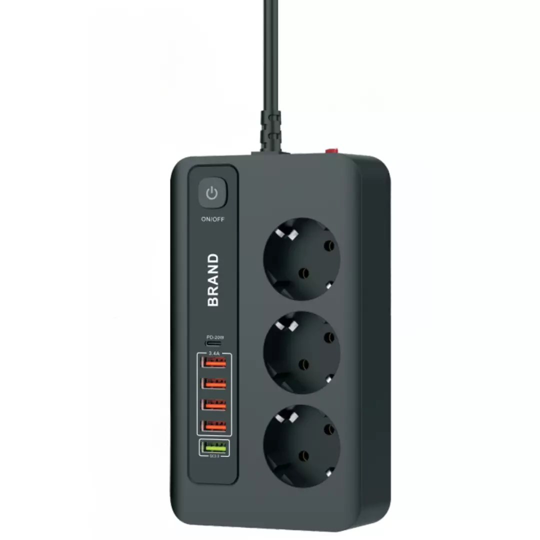 Сетевой фильтр BKL-04 1QC3.0 + 1 PD20W + 4 USB,100-250V, 10А,3 розетки, черный