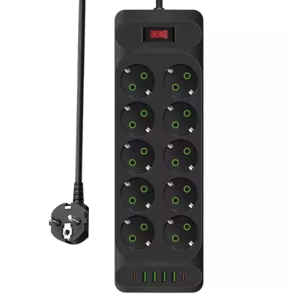 Этот мощный сетевой фильтр обеспечит надежное и безопасное подключение сразу нескольких устройств. Оснащен 10 евро-розетками с заземлением, а также 4 USB-A и 2 Type-C портами, что позволяет заряжать гаджеты без использования адаптеров. Благодаря максимальной мощности 3000 Вт и прочному корпусу из огнезащитного пластика (PC), устройство выдерживает высокие нагрузки и защищает вашу технику.