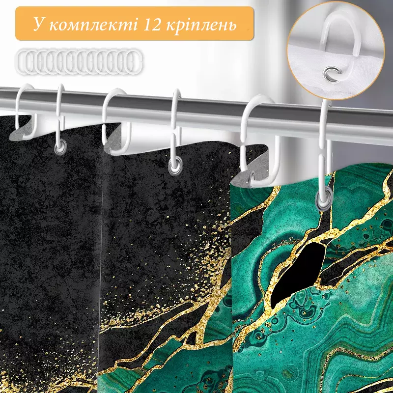 Материал шторки водонепроницаем и быстро сохнет, предотвращая появление плесени и обеспечивая гигиеничность. Шторка имеет 12 металлических люверсов, и в комплект входят 12 крючков, что упрощает установку. Легко стирается, сохраняя свои свойства, и не требует замены на протяжении длительного времени.