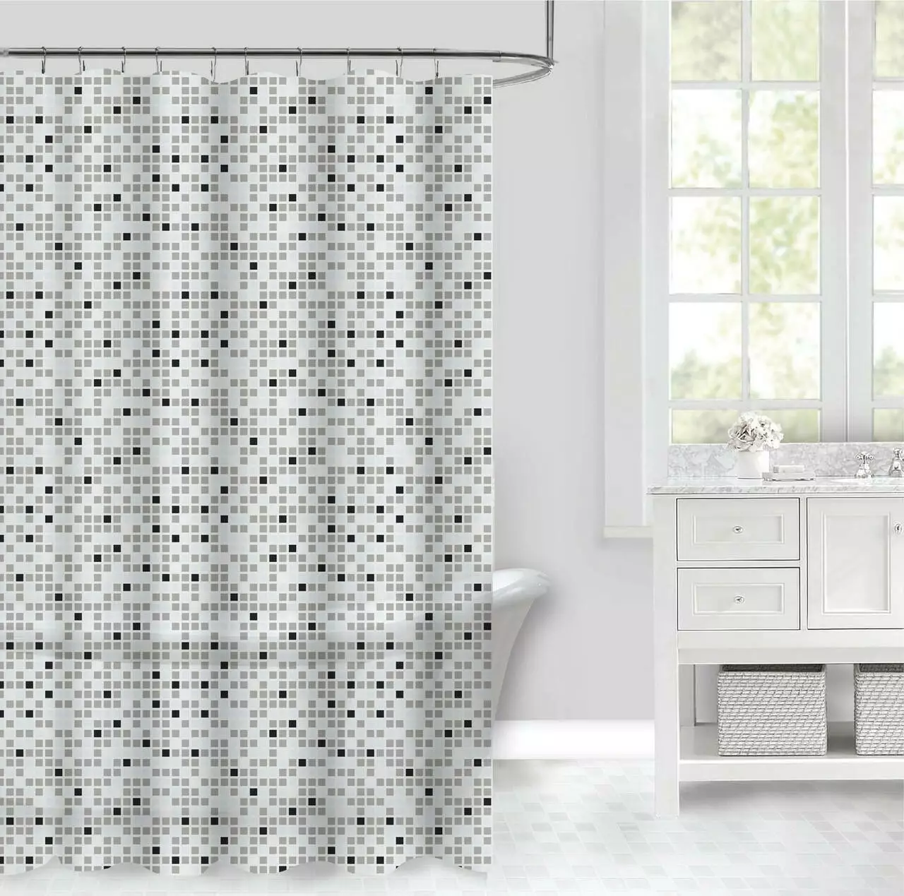 Размер 180x180 см универсален и подходит для стандартных ванн и душевых кабин. В комплекте 12 металлических роликовых крючков, которые гарантируют удобное крепление и легкое скольжение по перекладине.