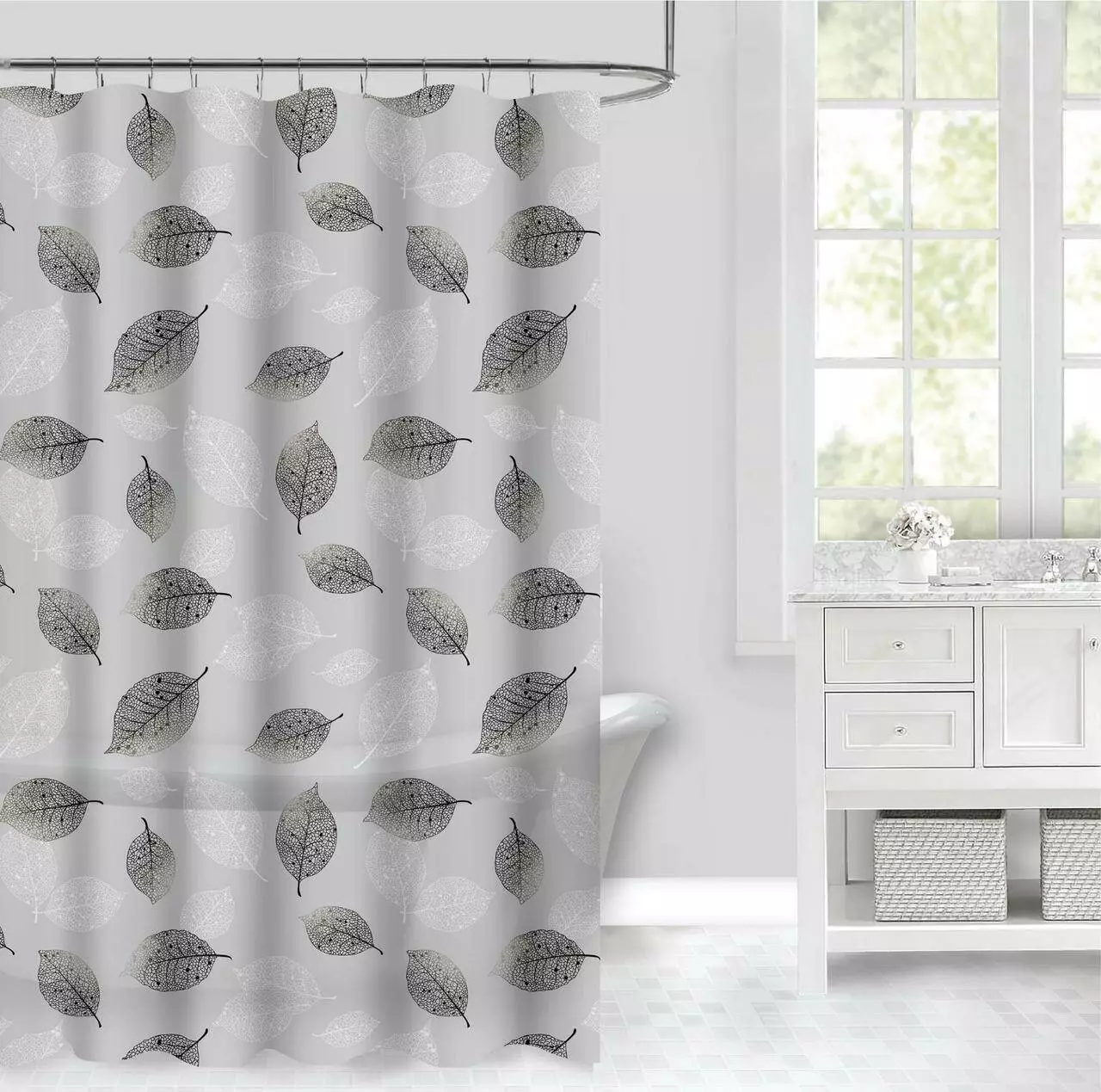 Размер 180x180 см подходит для стандартных ванн и душевых кабин. В комплект входят 12 металлических роликовых крючков, которые обеспечивают легкое и плавное скольжение по перекладине, а также надежную фиксацию.