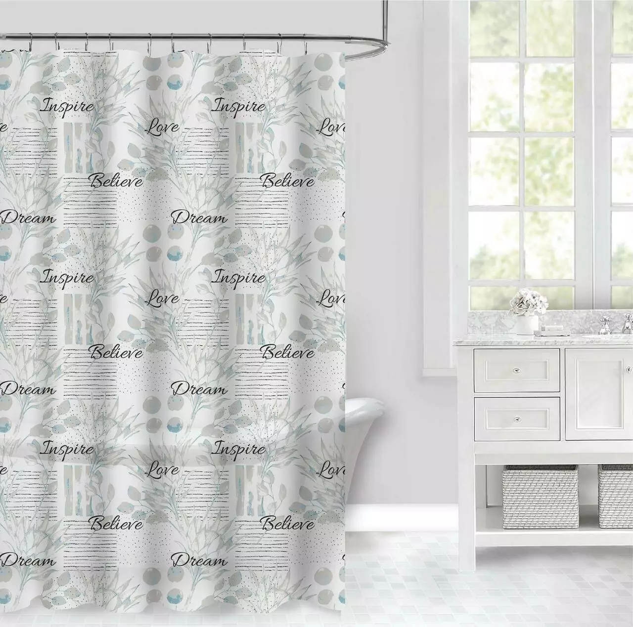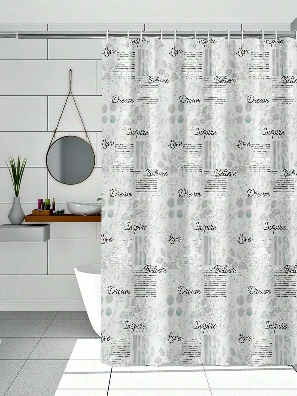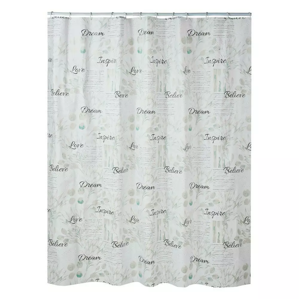 Элегантная и практичная шторка для душевой и ванной комнаты с принтом "Dream,Believe,Love,Inspire", что в переводе: Мечтайте, верьте, любите, вдохновляйтесь.Придаст интерьеру вдохновляющий и стильный вид. Изготовлена из PEVA – экологически безопасного, прочного и влагостойкого материала с плотностью 85 GCM, что гарантирует долговечность и удобство в использовании.
