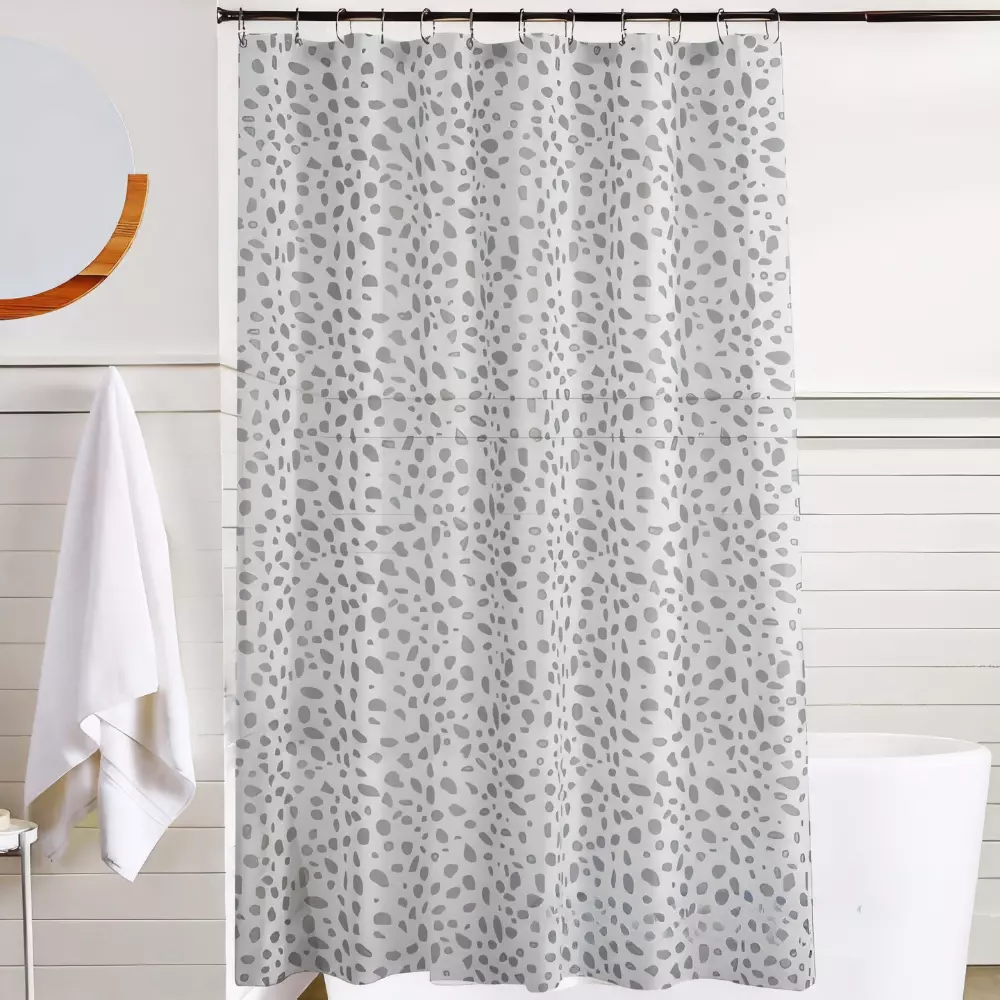 Штора изготовлена из 100% PEVA, экологичного и водоотталкивающего материала, устойчивого к влаге и плесени. В комплект входят 12 пластиковых крючков С-образной формы для удобного крепления. Идеально подходит для стандартных ванн и душевых кабин, легко очищается и не требует сложного ухода.