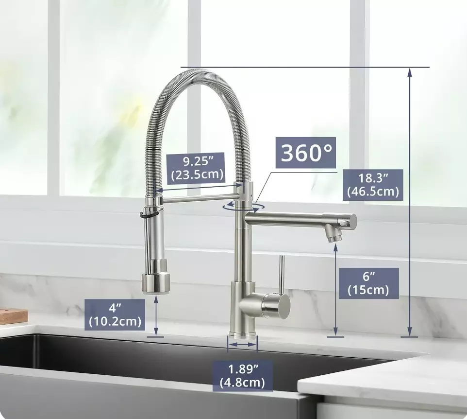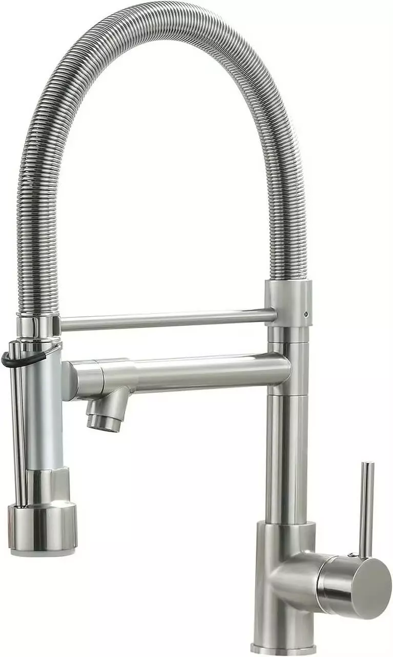 Этот кухонный смеситель сочетает практичность и стильный дизайн. Корпус выполнен из высококачественной латуни с содержанием до 59.9%, что обеспечивает прочность и долговечность конструкции. Матовый никель придает современный вид, а изливы из нержавеющей стали делают использование смесителя удобным и универсальным. Благодаря выдвижному и стационарному изливу, вы сможете легко переключаться между разными режимами использования.