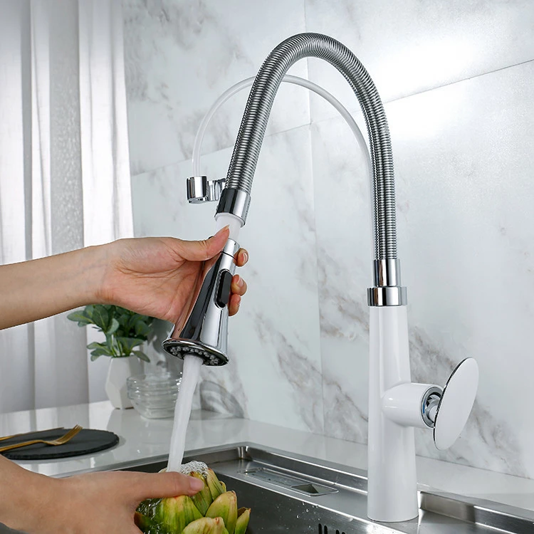 Смеситель кухонный выдвижной слив кран два режима воды вращающийся на 360 градусов WanFan Белый Хром с Белым