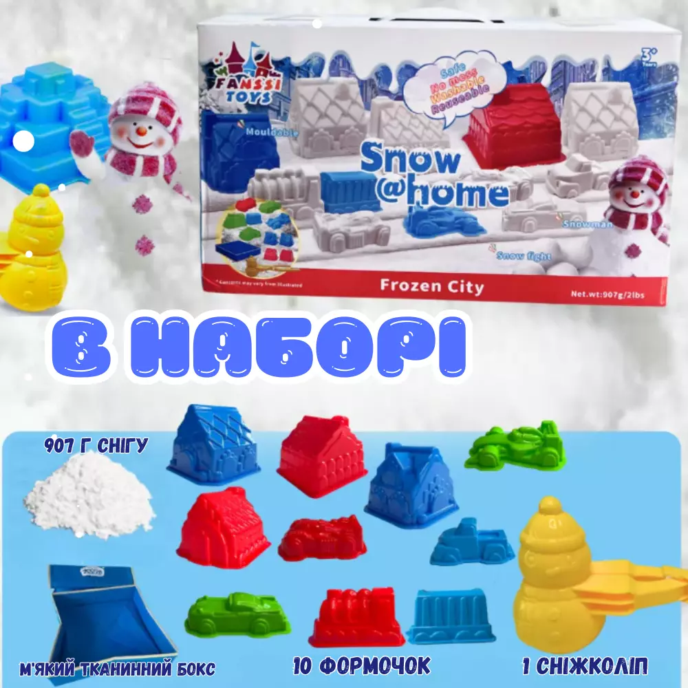 В комплект входит 907 г кинетического снега, снежколеп в виде снеговика, 10 формочек и мягкий складывающийся бокс-песочница, удобный для хранения и игры. Материалы безопасны и нетоксичны, что делает набор идеальным для детей от 3 лет.