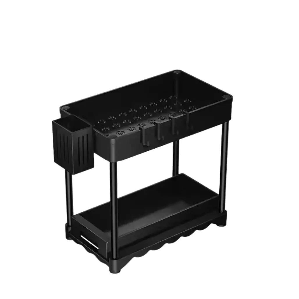 Конструкция стеллажа включает два уровня: верхнюю полку для хранения посуды, специй и мелкой бытовой техники, а также телескопическую нижнюю полку, которая легко выдвигается, обеспечивая быстрый доступ к нужным вещам. Металлический материал стеллажа гарантирует прочность и долговечность, выдерживая ежедневные нагрузки и влажность кухни.