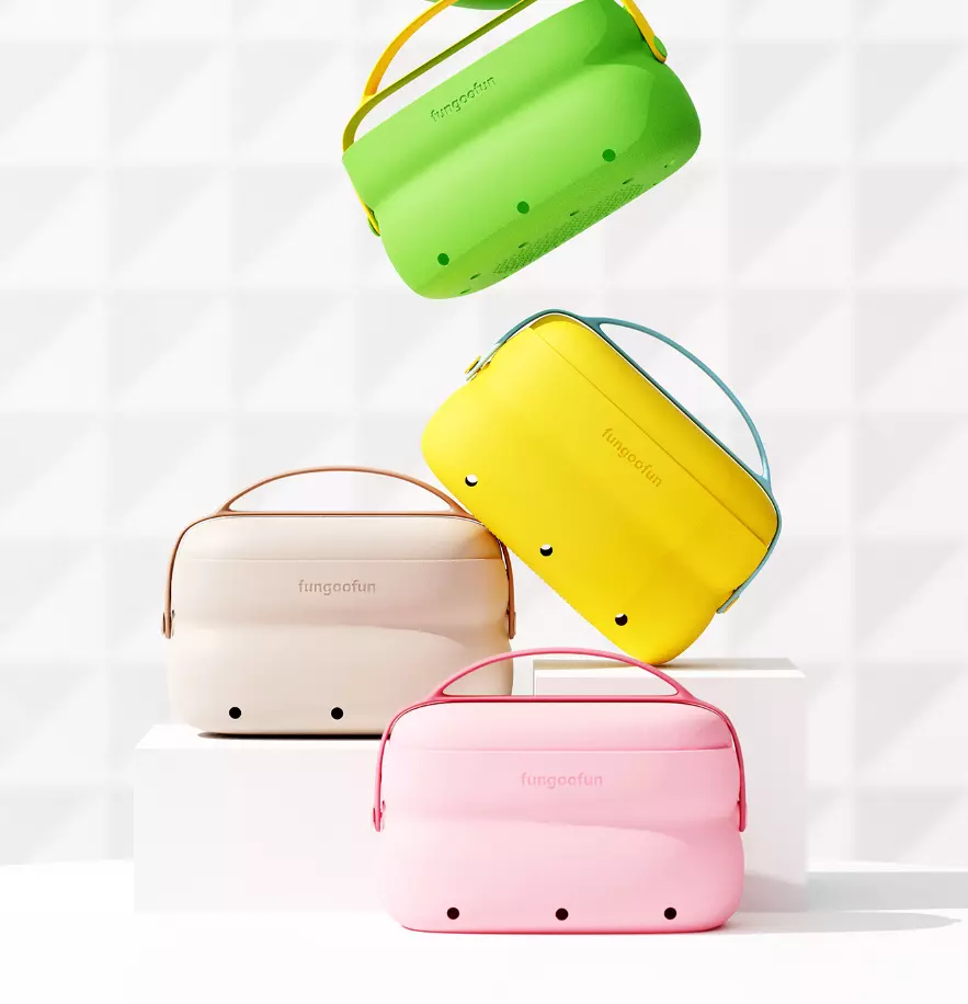 Сумка состоит из двух частей. Первая часть – это водонепроницаемая косметичка на молнии, идеально подходящая для хранения сухих вещей, косметики и аксессуаров. Вторая часть выполнена в виде корзины с силиконовой ручкой, предназначенной для хранения мокрых вещей. Специальные отверстия в нижней части корзины обеспечивают эффективный слив воды, предотвращая её скопление внутри. Весь аксессуар изготовлен из экологически чистого и безопасного материала EVA, который отличается эластичностью, мягкостью и устойчивостью к влаге и загрязнениям.