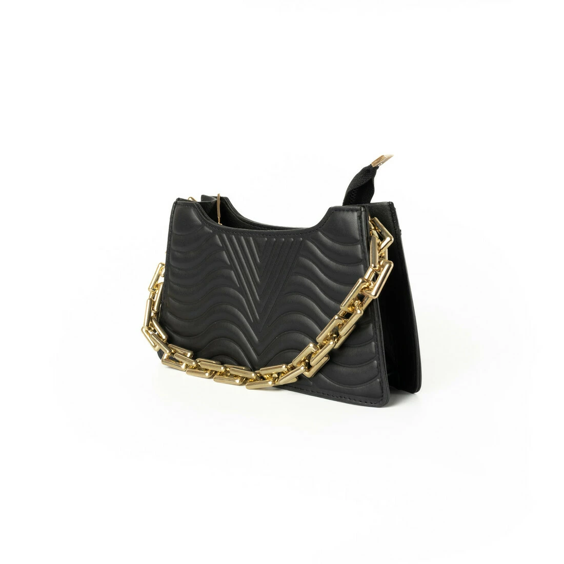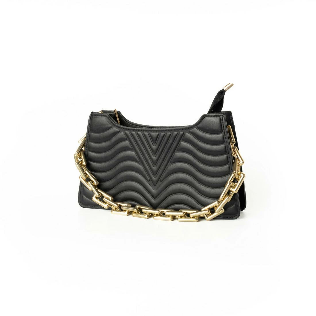 Сумка застегивается на змейку молнию. Ярким декором этой стильной сумочки является ручка-цепочка золотого цвета.