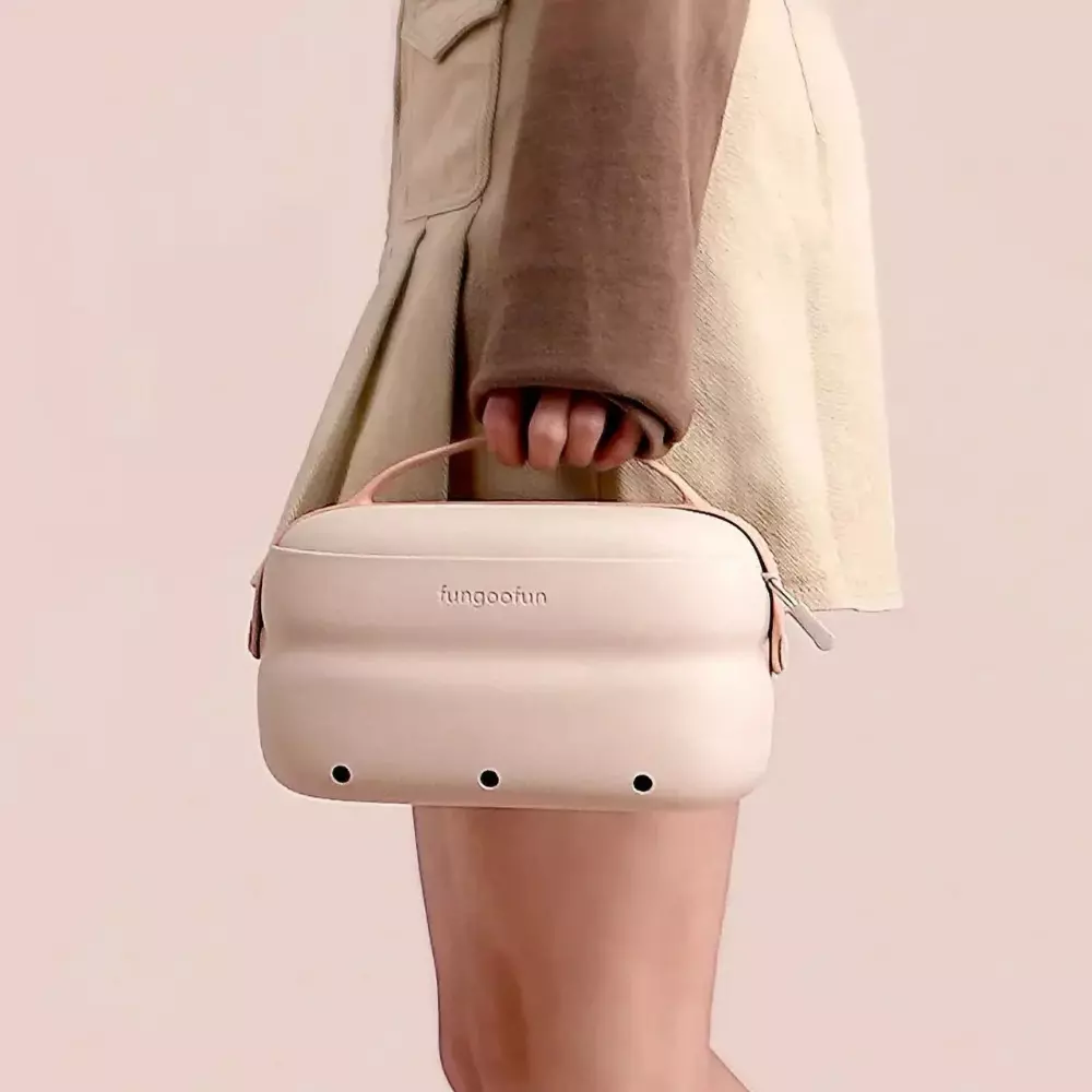 Сумка состоит из двух частей. Первая часть – это водонепроницаемая косметичка на молнии, идеально подходящая для хранения сухих вещей, косметики и аксессуаров. Вторая часть выполнена в виде корзины с силиконовой ручкой, предназначенной для хранения мокрых вещей. Специальные отверстия в нижней части корзины обеспечивают эффективный слив воды, предотвращая её скопление внутри. Весь аксессуар изготовлен из экологически чистого и безопасного материала EVA, который отличается эластичностью, мягкостью и устойчивостью к влаге и загрязнениям.