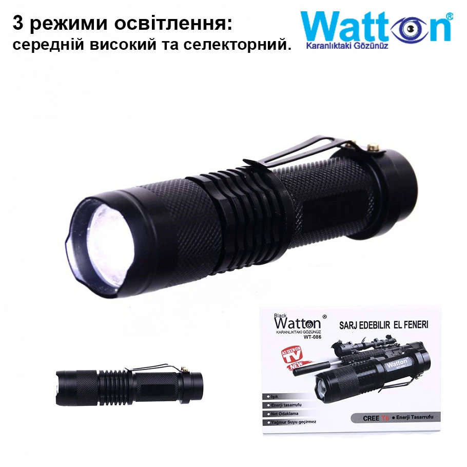 Watton WT-086 обладает многими важными преимуществами по сравнению с традиционными фонариками, такими как низкое энергопотребление, долгий срок службы, долговечность, небольшой размер. Свет, излучаемый светодиодами, связан со структурой полупроводниковых добавок внутри светодиодных чипов. Вы можете носить его, прикрепив к ремню или карману. Работает от 1 аккумулятора (18650).
