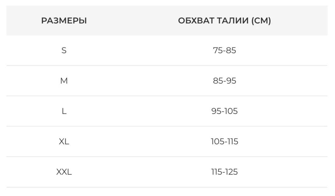 РАЗМЕРЫ ОБХВАТ ТАЛИИ (CM)