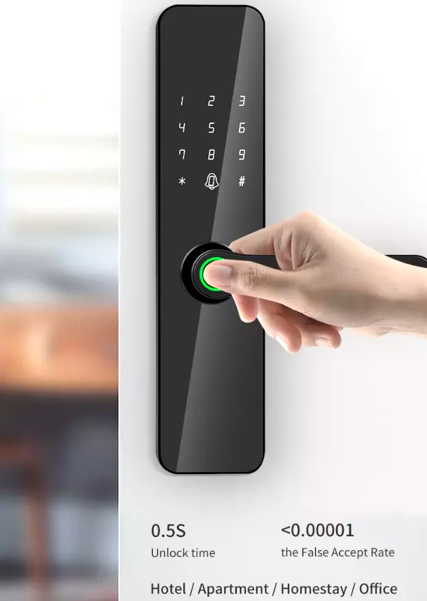 Датчик отпечатков пальцев — полупроводниковый, время разблокировки — менее 1 секунды.