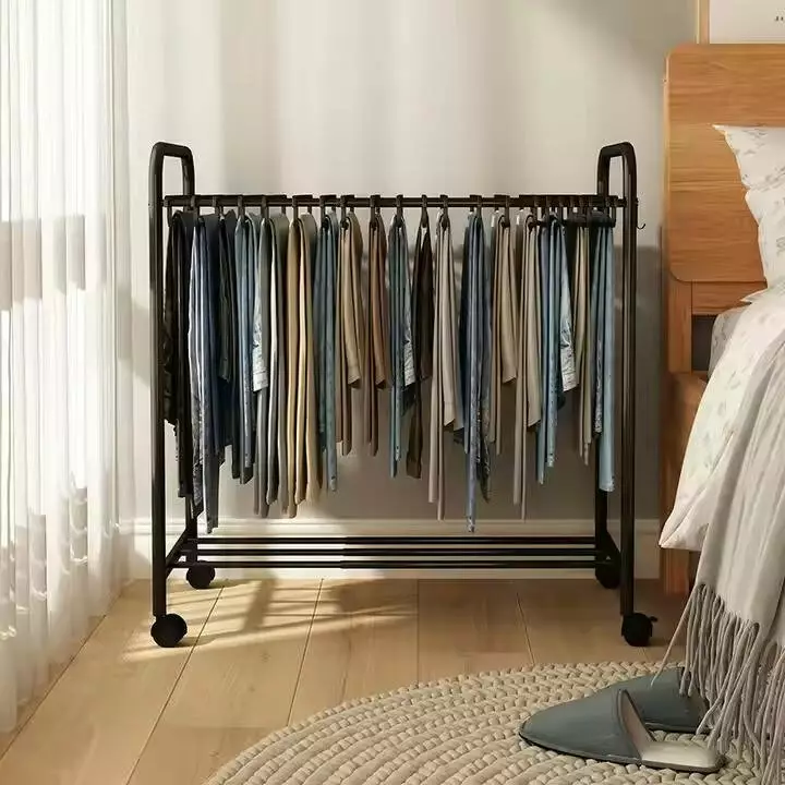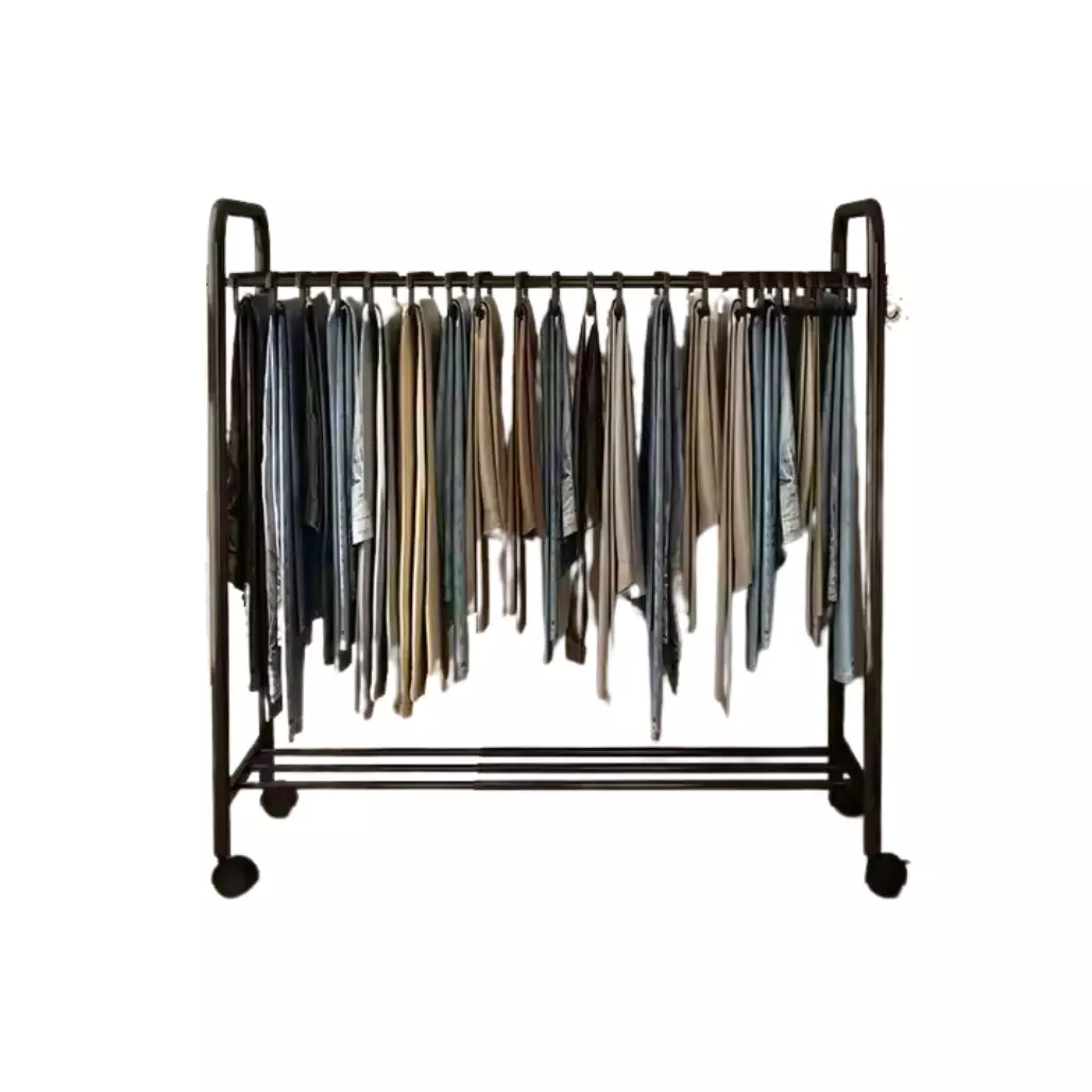 На вешалке предусмотрены пластиковые колеса с функцией передвижения, что делает ее удобной для перемещения. В комплекте вы найдете 22 пластиковых тремпеля, специально разработанных для брюк и штанов, которые помогут сохранить форму одежды без заломов. Нижняя полка добавляет дополнительное пространство для хранения обуви, обеспечивая функциональное использование вертикального пространства.