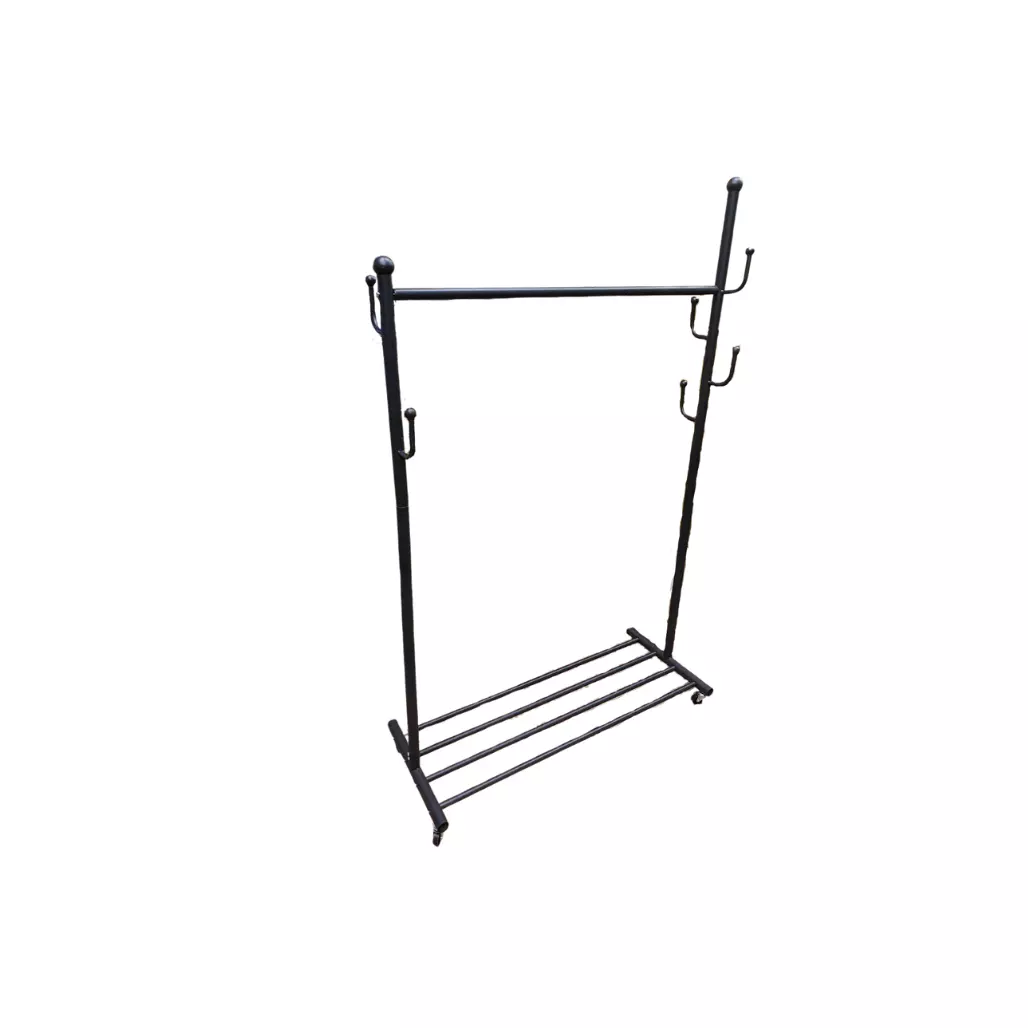 Конструкция вешалки изготовлена из прочного металла, что гарантирует долгий срок службы и устойчивость к нагрузкам. Вешалка оборудована стойкой для тремпелей, которая подходит для хранения верхней одежды, платьев, костюмов и других предметов гардероба. Дополнительная стойка с крючками на боковой стороне предназначена для удобного размещения сумок, шляп, зонтов и других аксессуаров, экономя пространство и облегчая доступ к ним.