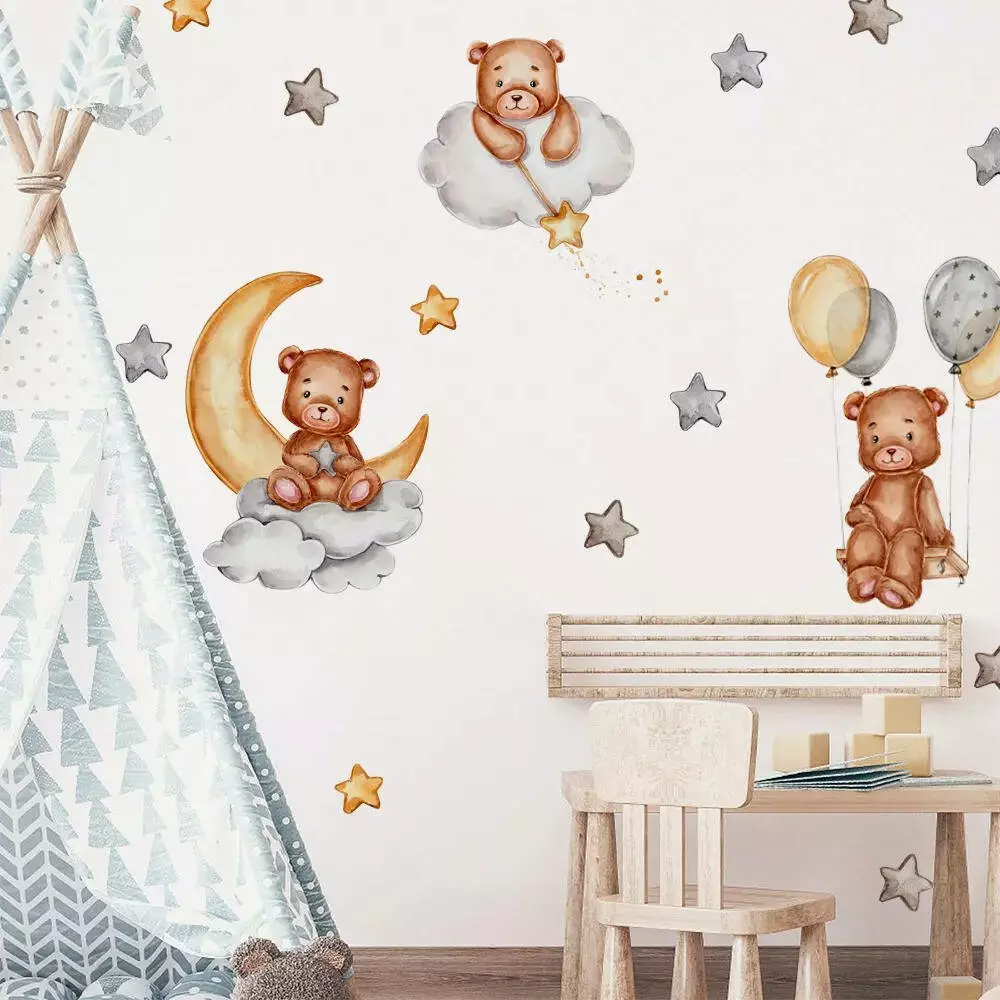 Виниловые наклейки "Медвежата" создают атмосферу сказки и уюта в детской комнате. Этот уникальный набор позволяет окунуться в волшебный мир звездного неба, где милые медвежата играют среди облаков и воздушных шаров. Каждый элемент выполнен с любовью к деталям, что делает композицию невероятно нежной и притягательной для малышей.