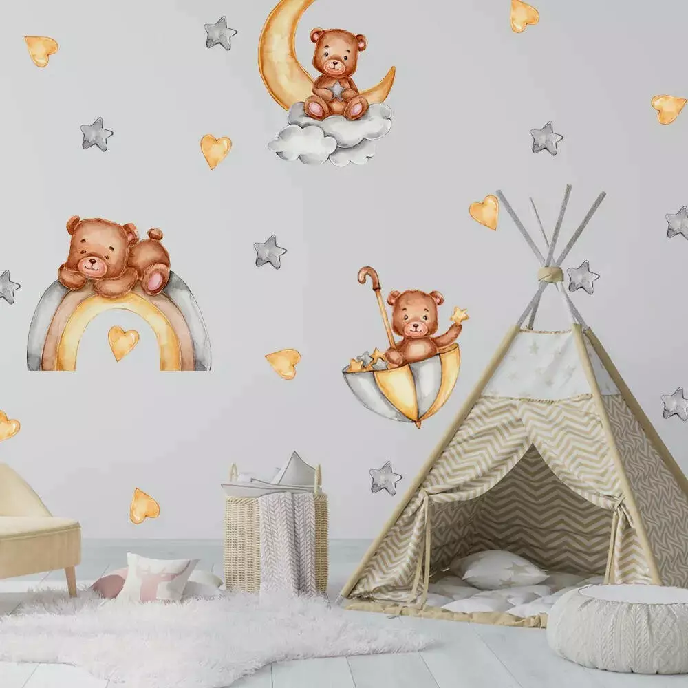 Этот набор станет отличным выбором для создания уюта и сказочного настроения в детской комнате. Малыши будут в восторге от медвежат, которые так красиво украшают пространство. Наклейки легко приклеиваются и удаляются, не оставляя следов, что делает их универсальным решением для любого интерьера.