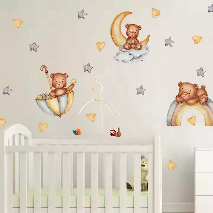Набор наклеек изготовлен из качественного винила (ПВХ), что гарантирует их долговечность и безопасность для ребёнка. Каждая наклейка обладает яркими цветами, которые не выгорают на солнце и долго сохраняют свой первозданный вид. Лёгкость в применении позволяет создать свою собственную композицию: вы можете самостоятельно разместить медвежат, радугу, облака и звёзды так, чтобы они идеально вписались в интерьер детской комнаты.