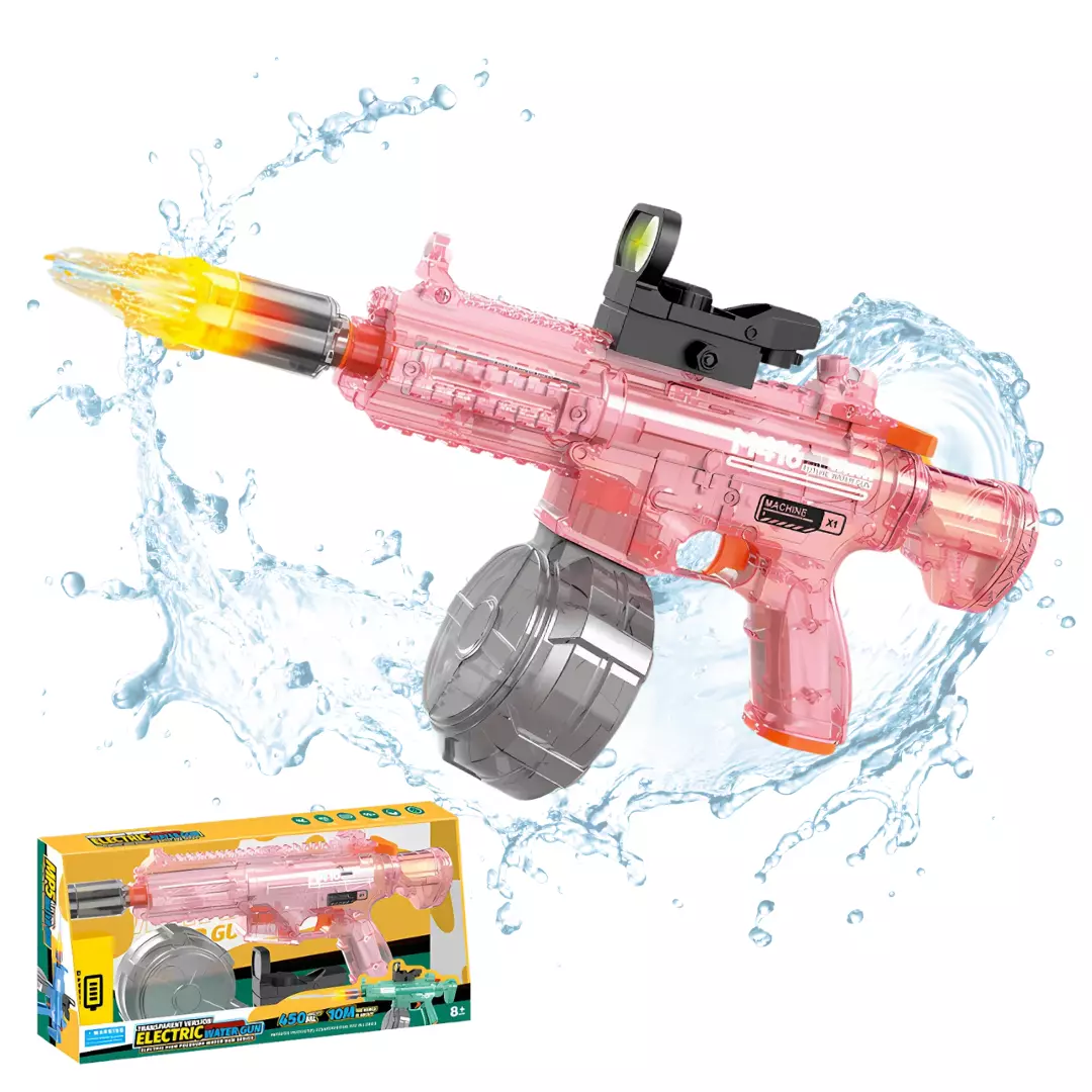 Корпус бластера выполнен из прозрачного ABS-пластика, что делает его прочным и устойчивым к ударам. Эргономичный дизайн обеспечивает удобный хват, а надежная изоляция защищает аккумулятор и электронику от влаги. Встроенный аккумулятор обеспечивает до 50 минут автономной работы, а полная зарядка занимает всего 2 часа через USB-кабель. Дальность стрельбы достигает 8–10 метров, а резервуар объемом 450 мл позволяет играть без частых дозаправок.