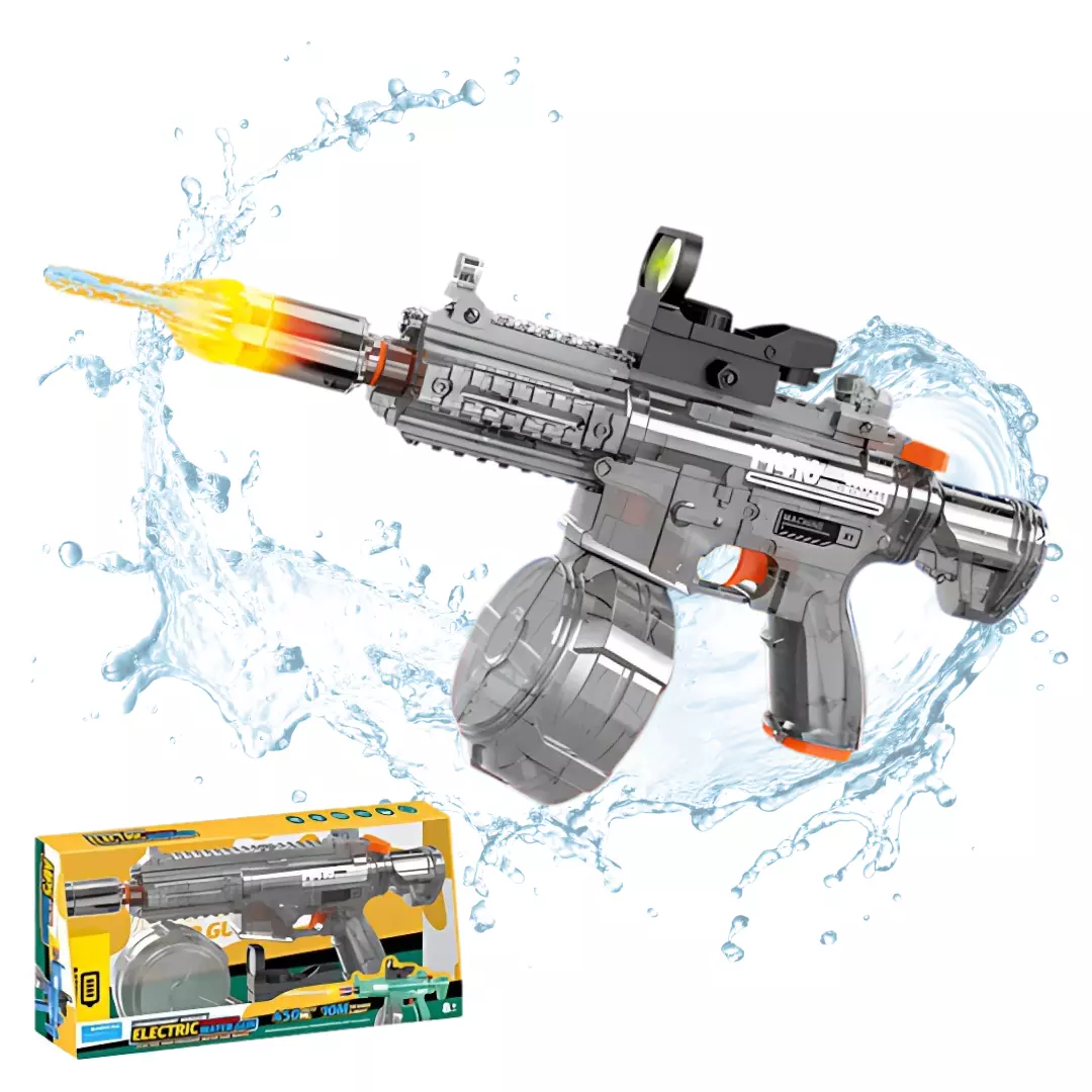 Корпус бластера выполнен из прозрачного ABS-пластика, что делает его прочным и устойчивым к ударам. Эргономичный дизайн обеспечивает удобный хват, а надежная изоляция защищает аккумулятор и электронику от влаги. Встроенный аккумулятор обеспечивает до 50 минут автономной работы, а полная зарядка занимает всего 2 часа через USB-кабель. Дальность стрельбы достигает 8–10 метров, а резервуар объемом 450 мл позволяет играть без частых дозаправок.