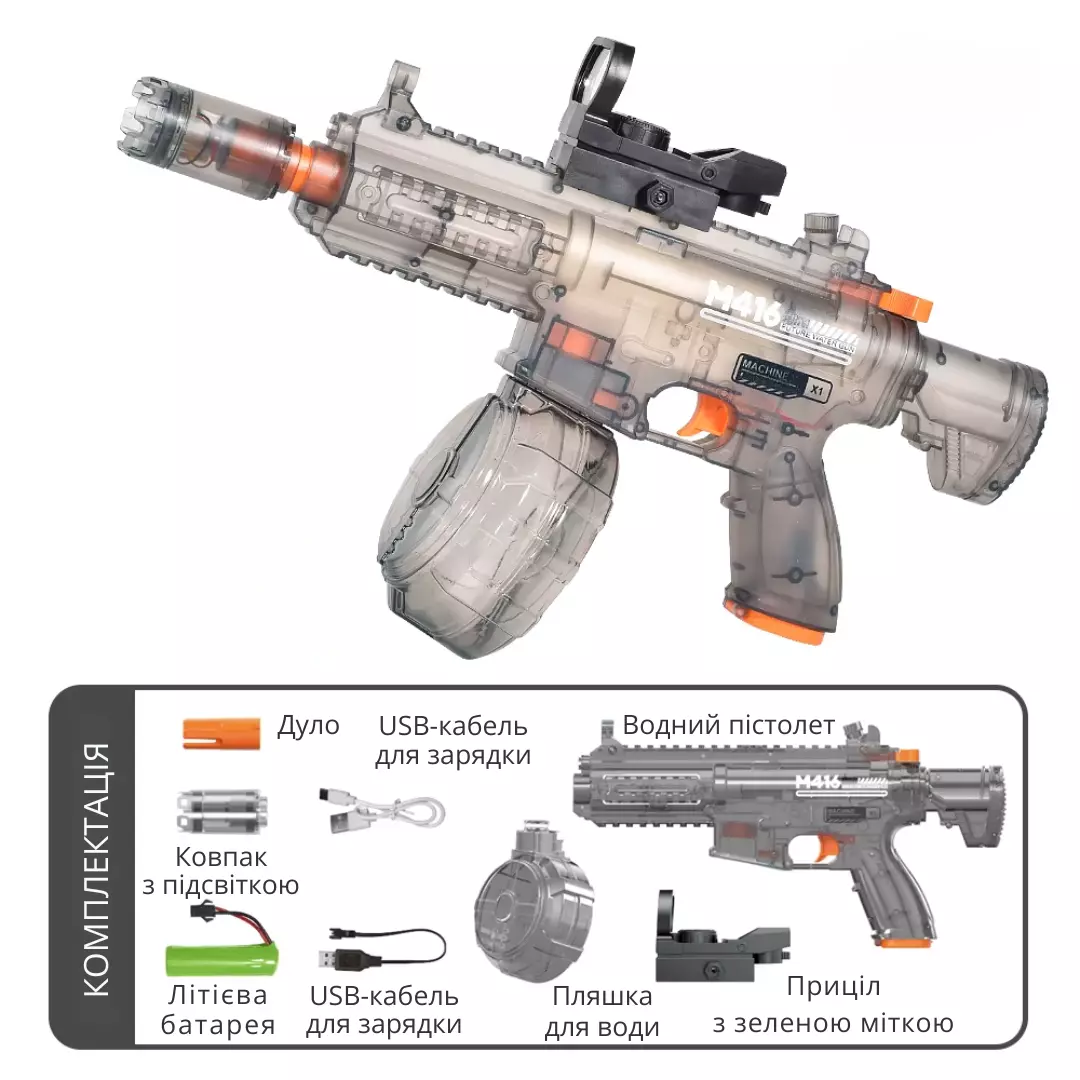 Комплектация: водяной пистолет М416, дуло, глушитель со световыми эффектами, прицел с лазерной зеленой подсветкой, батарея, USB-кабель для зарядки, резервуар для воды 450мл