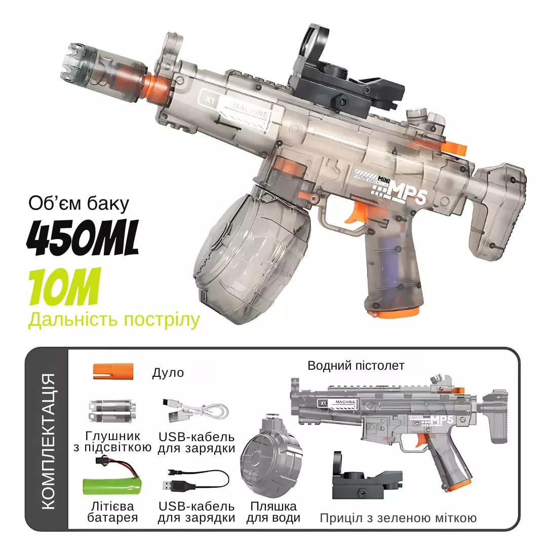 Комплектация: водяной автомат МР5, дуло, глушитель со световыми эффектами, прицел с лазерной зелёной подсветкой, аккумулятор, USB-кабель для зарядки, резервуар для воды объёмом 450мл