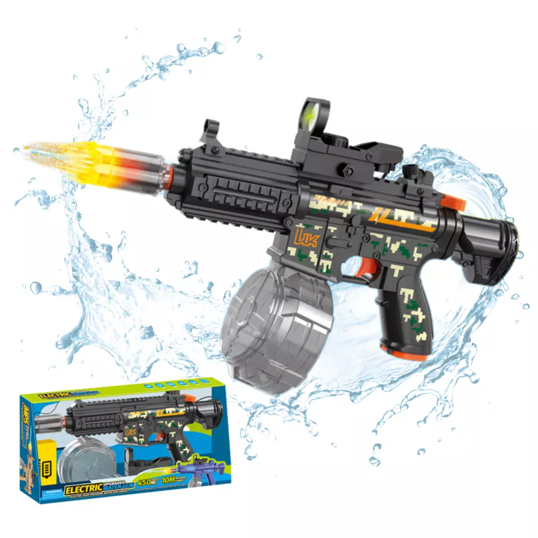 Корпус выполнен из ABS-пластика, что делает его устойчивым к ударам и долговечным. Удобный дизайн обеспечивает комфортное удержание, а надежная изоляция защищает аккумулятор и электронику от влаги. Встроенный аккумулятор поддерживает до 50 минут работы без подзарядки. Полное время зарядки составляет 2 часа через USB-кабель. Дальность стрельбы достигает 8–10 метров, а резервуар для воды объемом 450 мл позволяет вести продолжительные водные битвы без частых дозаправок.