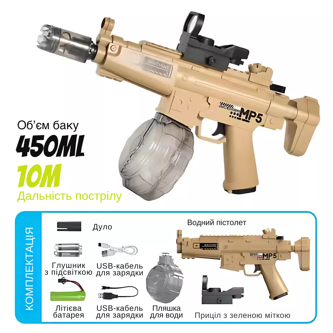 Комплектация: водяной пистолет МР5, дуло, глушитель со световыми эффектами, прицел с лазерной зелёной подсветкой, аккумулятор, USB-кабель для зарядки, резервуар для воды объёмом 450 мл