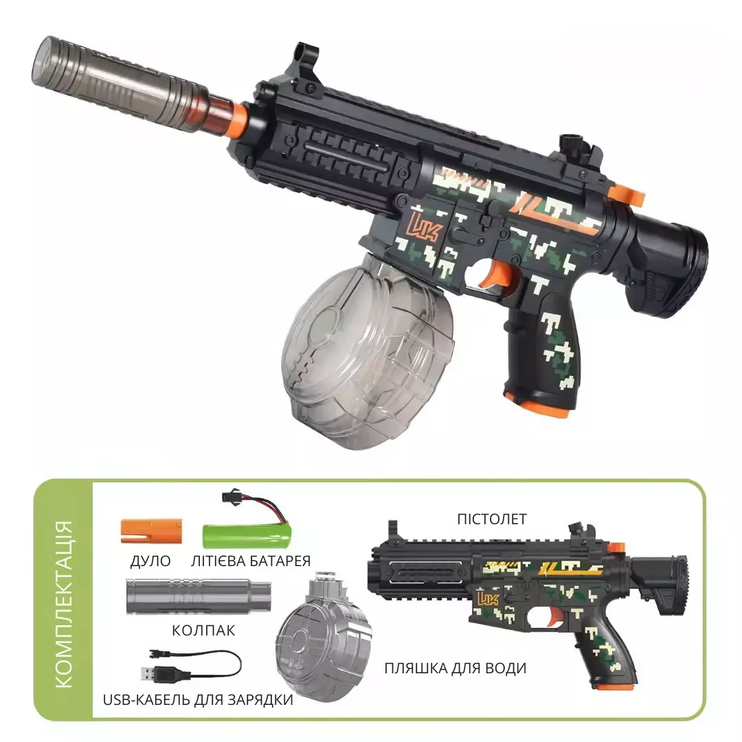 Комплектация: водяной пистолет М416, дуло, глушитель, батарею, USB-кабель для зарядки и резервуар для воды 450мл