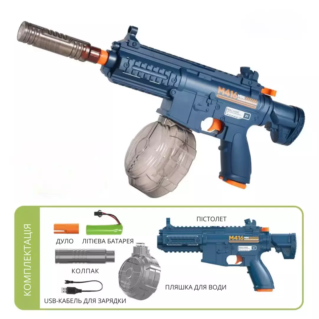 Комплектация: водяной пистолет М416, дуло, глушитель, батарею, USB-кабель для зарядки и резервуар для воды 450мл