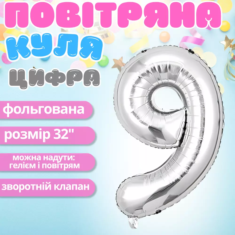 Воздушный шар в виде цифры 9 серебро,32 дюйма, фольгированый, для праздников для дня рождения, юбилеев,