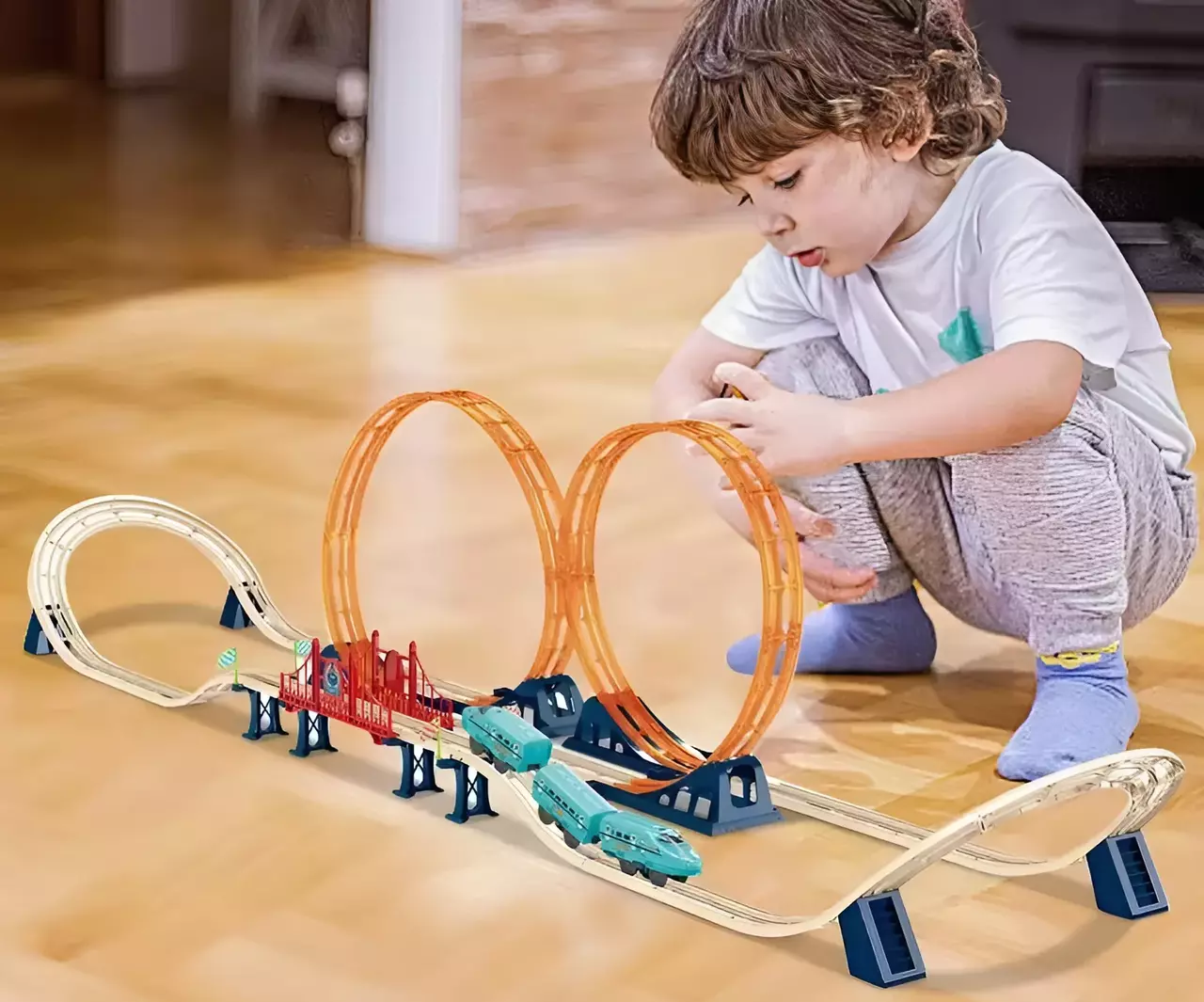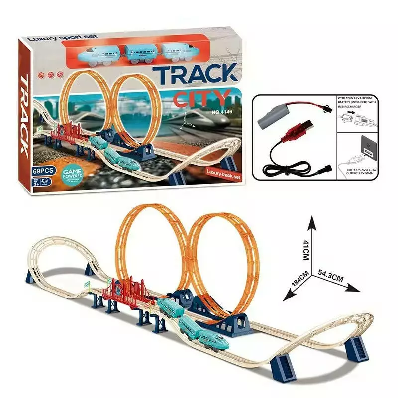 Трек включает две мертвых петли высотой 41 см, что добавляет дополнительный элемент захватывающего экшена. Размеры трека (ширина 54.3 см, длина 184 см) позволяют ребенку строить разнообразные маршруты и испытывать поезд на максимум. В комплекте также предусмотрено зарядное устройство с подключением USB-A, что обеспечивает удобную зарядку аккумулятора.